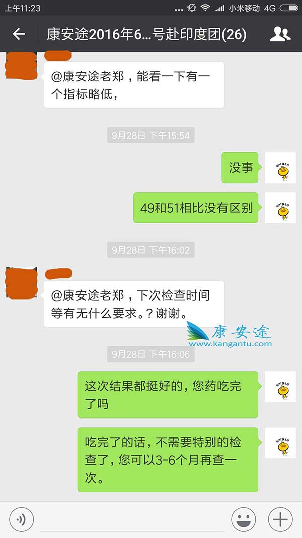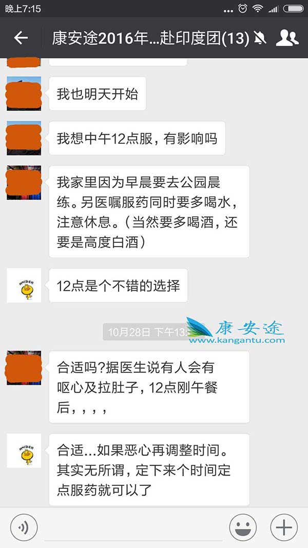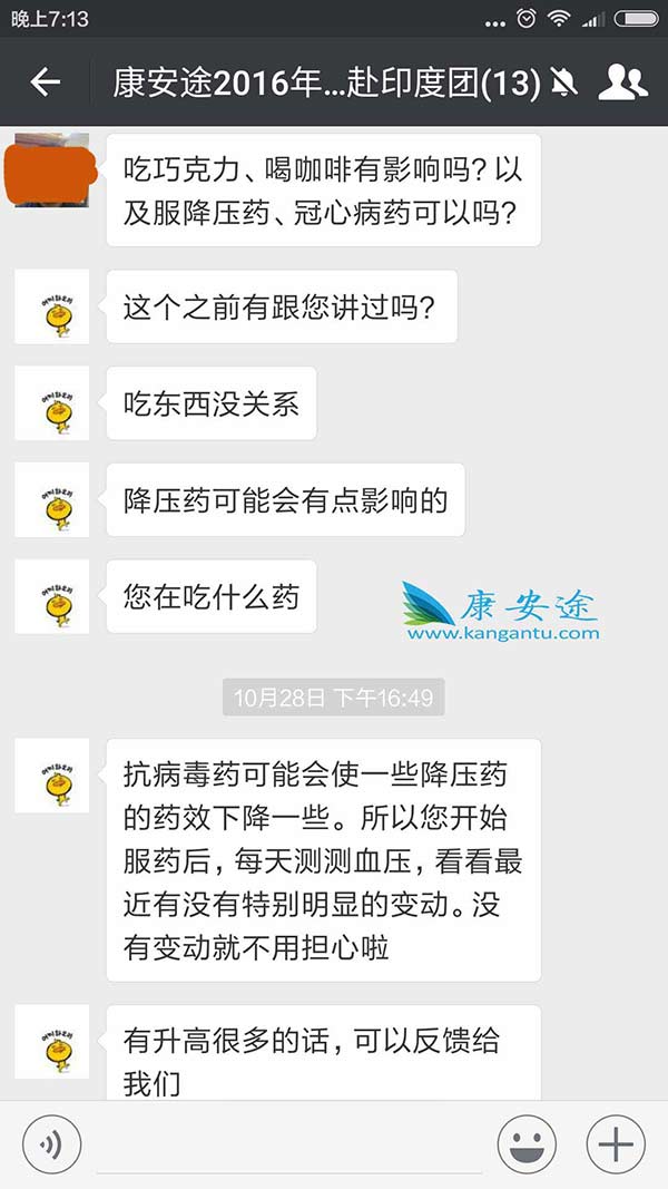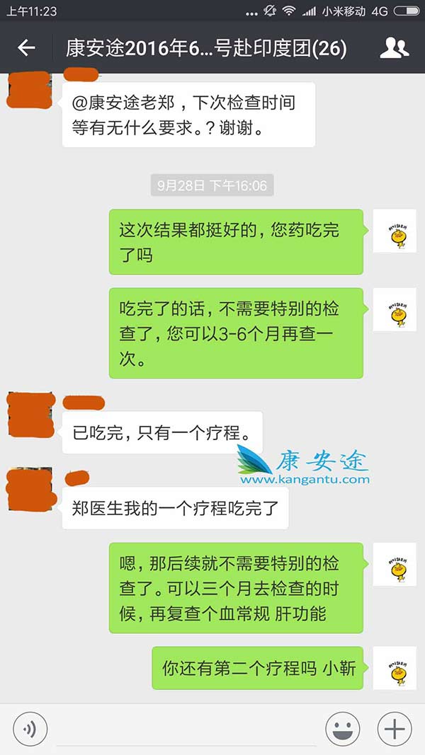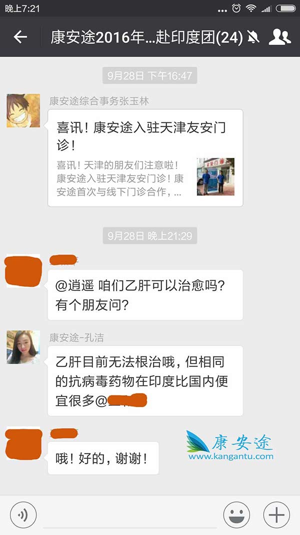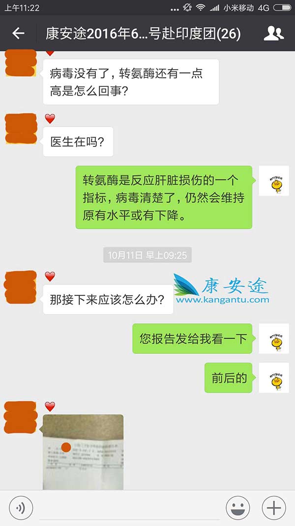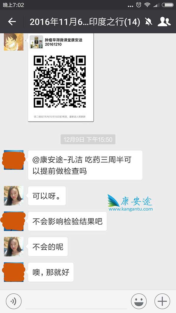 随康安途去印度就医的丙友团,每一个团都建立一个微信群,在群里,有康安途博士专家,患者在日常用药过程中任何疑问都可以提出来,让患者安心用药,快速康复。