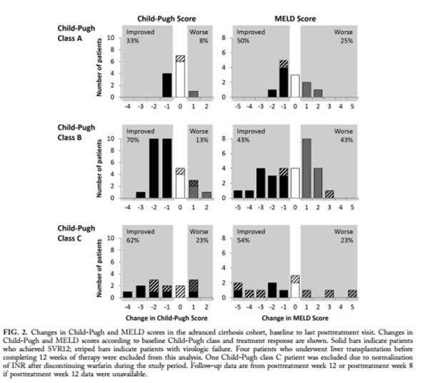 他们的结果表明,在肝功能失代偿的患者(也就是C-P 分级在C级的患者)中,SVR12的水平只有56%,而在相对较轻的患者中(A,B级),可以达到93%以上。