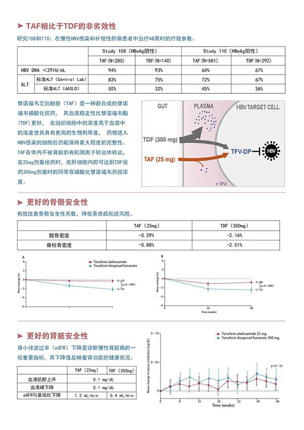 TAF(tenofovir alafenamide fumarate,替诺福韦艾拉酚胺富马酸)是一种新型核苷类逆转录酶抑制剂(NRTI),在临床试验中已被证明在低于吉利德已上市药物Viread(替诺福韦酯,TDF)十分之一剂量时,就具有非常高的抗病毒疗效,同时可改善肾功能和骨骼方面参数。TDF也是一种新型NRTI药物,目前被广泛用于HIV(艾滋)和HBV(乙肝)的治疗。