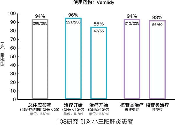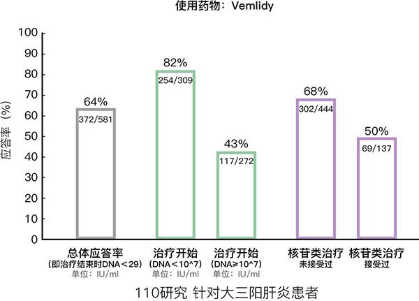 报告中提到两个重要的研究108研究和110研究,分别针对小三阳肝炎患者和大三阳肝炎患者。两个研究分别将用户按照两个维度分组: