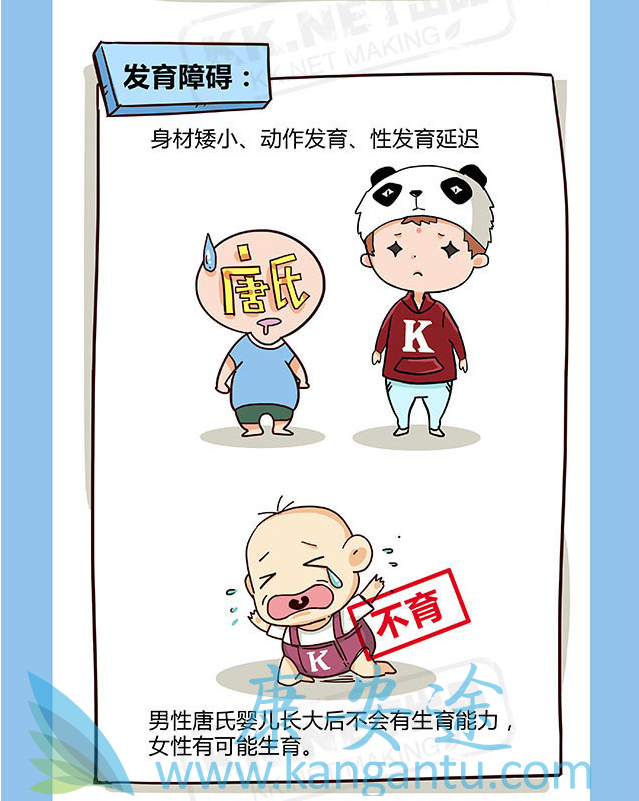 唐氏患儿的身材一般都比较矮小,动作发育以及性发育延迟。男性唐氏患儿长大后没有生育能力,女性则有可能生育。
