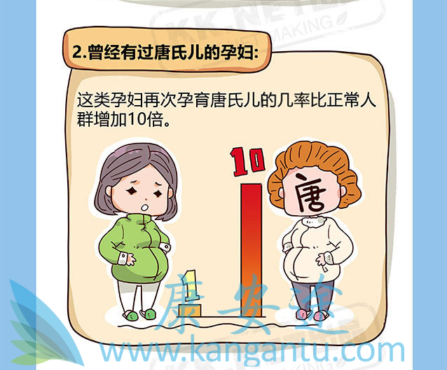 曾经有过唐氏儿怀孕经历的孕妇,再次孕育唐氏儿的几率要比正常人群增加十倍的风险。