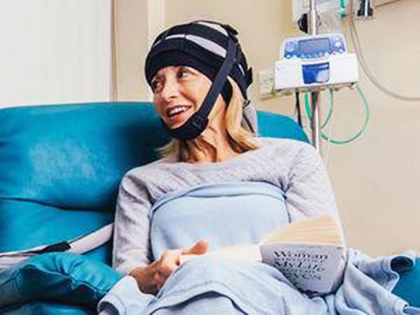 (一名患者在接受化疗时佩戴头皮冷却系统,即俗称的冰帽)