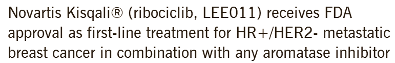 昨日3.13,诺华官网首曝乳腺癌新药ribociclib又称LEE011得到了FDA批准,与芳香化酶抑制剂(来曲唑、依西美坦等)用于绝经后HR+/HER2-转移性乳腺癌患者治疗。