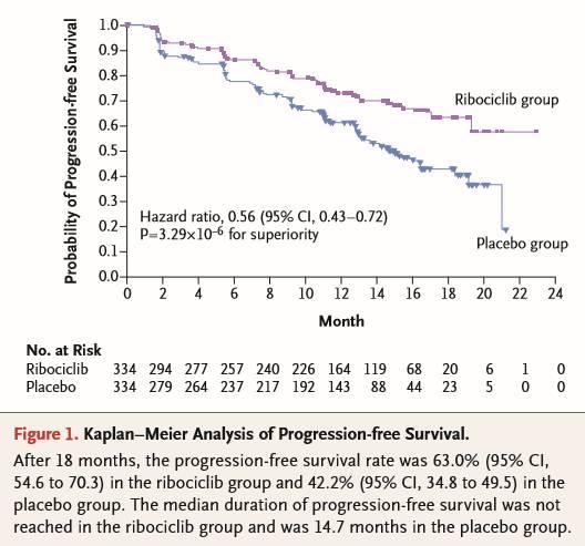 此次FDA对Ribociclib的批准基于III期MONALEESA-2临床试验。在该试验中,收录了668例绝经后HR+/HER2-晚期乳腺癌患者,一线分别使用来曲唑或来曲唑联合Ribociclib治疗,结果显示Ribociclib与来曲唑联合用药较来曲唑单药可以将进展或死亡风险下调44%。在中期分析时间里,联合组中一半以上的患者还未出现进展,因而联合组的中位PFS还没法计算,意味着很长,(19.3月-未达到),而来曲唑单药治疗组患者绝大多数出现进展,PFS是14.7个月(13.0-16.5),两组P<0.0001,有显著统计学差异。而且联合治疗组中53%的患者病灶肿块减少至少30%。两组有效率分别达到41%:28%。
