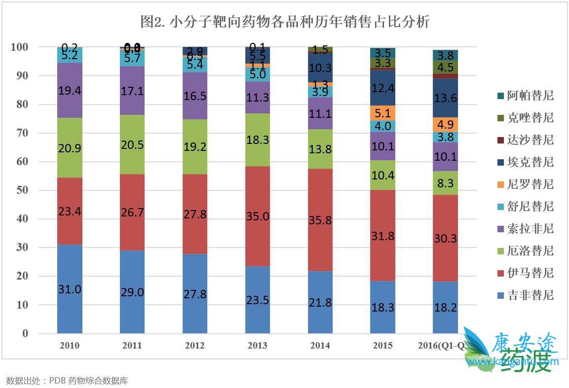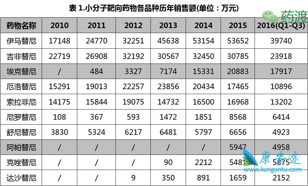 随着小分子靶向药物在临床应用的日益增多,肿瘤治疗已进入了靶向药物治疗时代,小分子靶向药物也已逐渐开始替代传统的化疗药物,成为某些肿瘤领域的一线用药,如非小细胞肺癌、肾癌、慢性粒细胞白血病、多发性骨髓瘤等。
