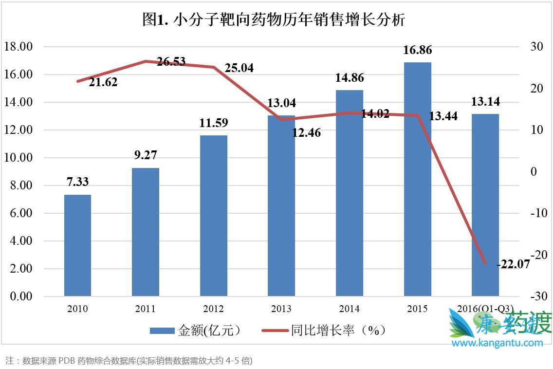 近年来,小分子靶向药物市场也迎来了快速增长期。自2010年以来,重点城市样本医院销售额年增长率均保持在10%以上,2011年全年较2010年增长率达到了26.53%。从2013年开始,增长速度略有放缓,但在整个抗肿瘤药物市场中的所占份额并未下降。2015年样本医院市场已达16.86亿元,放大后的终端市场大约为70-80亿元。