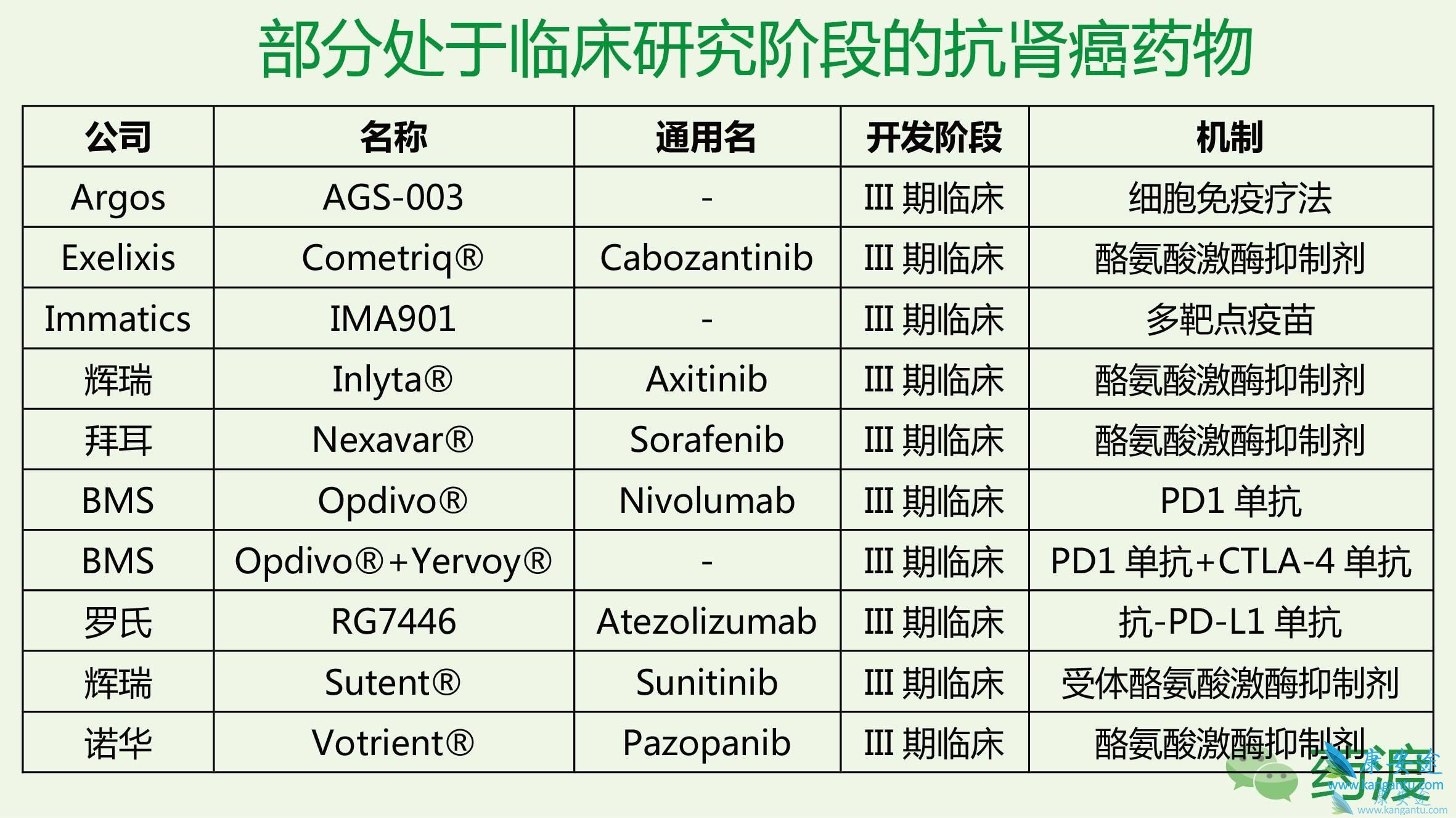 靶向治疗药物和新型的免疫治疗是人们抵抗肾癌的两把利器,随着科学研究的不断发现,将会有越来越多的靶点被发现,同时在癌症的免疫治疗方面,研究者正在探索更新型的途径来释放以及增强免疫系统对癌细胞的攻击和杀伤作用,有了nivolumab作为成功的先例,更多的免疫节点抑制剂正在处于研究之中,新型的免疫节点抑制剂或许会对晚期肾癌产生更强大的功效,同时将不同的免疫节点抑制剂联合使用或许会产生奇效。而另一种免疫疗法:治疗性肿瘤疫苗在不久的将来也将会用来治疗晚期肾癌,治疗性肿瘤疫苗可以有效的刺激免疫系统攻击癌细胞,就像抗病毒的疫苗激活免疫系统清除外部入侵的病毒一样。免疫疗法的前景不可限量,更多先进新颖的免疫疗法正处于研究之中,目前全球有超过50种抗肾癌药物正处于临床研究中,其中部分至少处于III期临床研究的如下表所示。过去10年的肾癌治疗发展不仅发现了这些新型的药物,研究者同时还在不断的优化联合治疗的药物搭配方法,由于癌症复杂性,将多种不同机制的治疗药物联合起来使用可更有效的杀伤肿瘤细胞,同时还能预防肿瘤产生抗药性,这使得肾癌的治疗前景更加的光明。