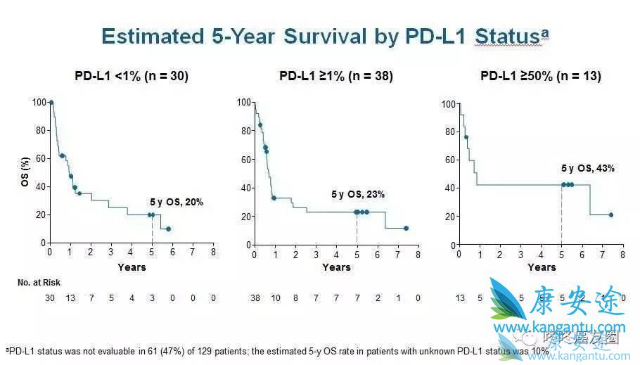 注意:这129名患者只有68位患者做过PD-L1检测,以上的数据都是基于这68位患者。而对于没有进行PD-L1检测的61位患者,5年的生存率是10%。这就很奇怪:68名检测过PD-L1的患者的5年生存率超过了20%,而61名没有检测过PD-L1表达的患者的生存率是10%,差了两倍,有些奇怪。