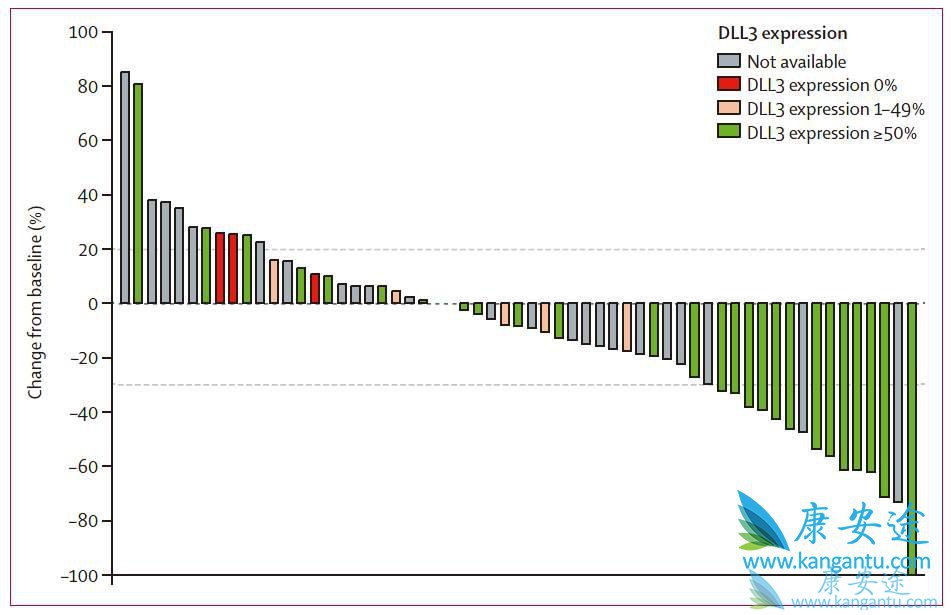 临床成绩:在60名可评估的小细胞肺癌患者中,11名(18%)患者达到肿瘤缓解(缩小30%以上),30名(50%)患者获得疾病稳定,疾病控制率达到68%(=18%+50%)。而且,DLL3高表达与低表达患者相比,有更好的肿瘤缓解率(38% PK 0%)和疾病控制率(88% PK 50%)。中位无进展生存期2.8个月,总生存期4.6个月。最大可耐受剂量是0.4mg/kg每3周,后续在2期试验中推荐剂量是0.3mg/kg每6周。