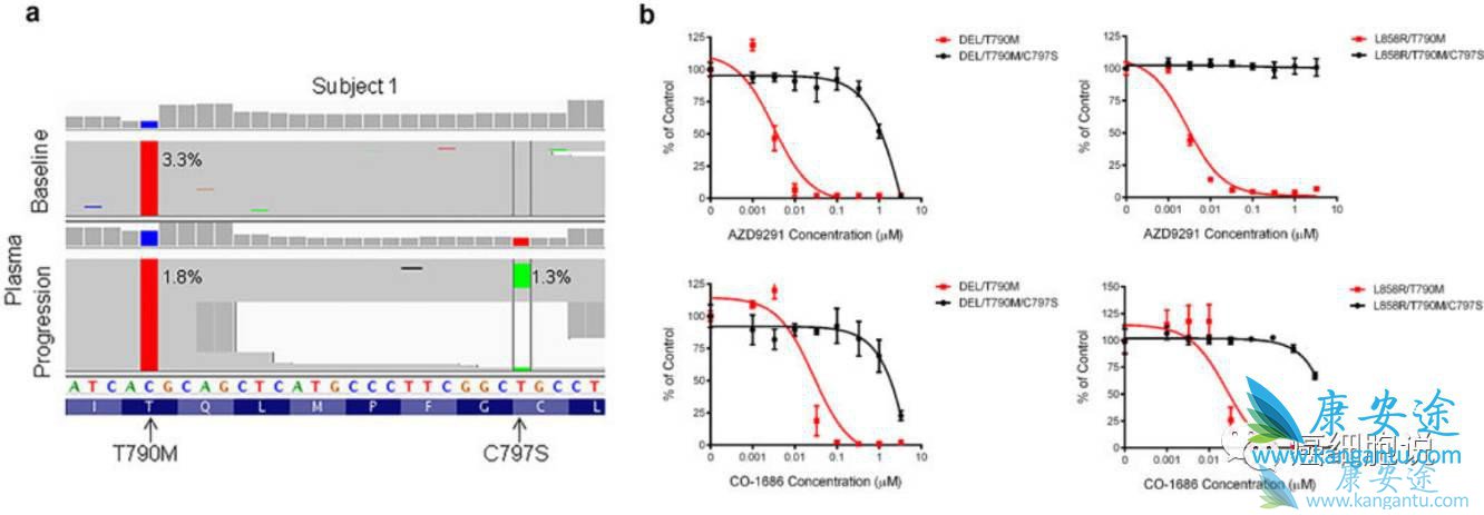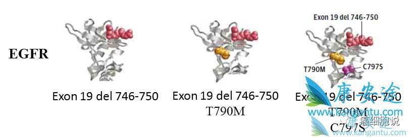 EGFR-C797S是EGFR 20外显子797位点上丝氨酸取代了半胱氨酸的错义突变, C797S位于EGFR的酪氨酸激酶区。该突变发现于osimertinib(AZD9291)治疗的I期AURA试验患者的循环肿瘤DNA(ctDNA)中(15例患者中有6例,40%)。随后发现,C797S等位基因的突变情况可能会影响后续TKIs的治疗效果。当C797S与T790M突变位于不同染色体上即突变是反式的,细胞将对第三代EGFR-TKIs耐药,但对第一代和第三代TKIs组合用药敏感;如果C797S在T790M野生型细胞中发生,则会导致第三代TKIs耐药,而同时对第一代TKIs的敏感性保留。