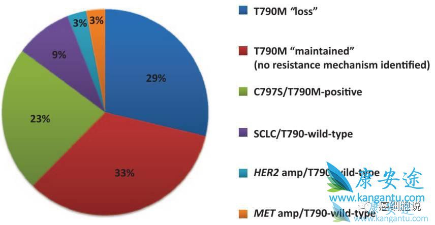 此外,EGFR-T790M突变的丢失、组织学转化(NSCLC-SCLC)、FGFR1的扩增、PTEN 的丢失、MAPK1或AKT3的过表达也有可能是引起三代EGFR-TKIs的耐药原因。