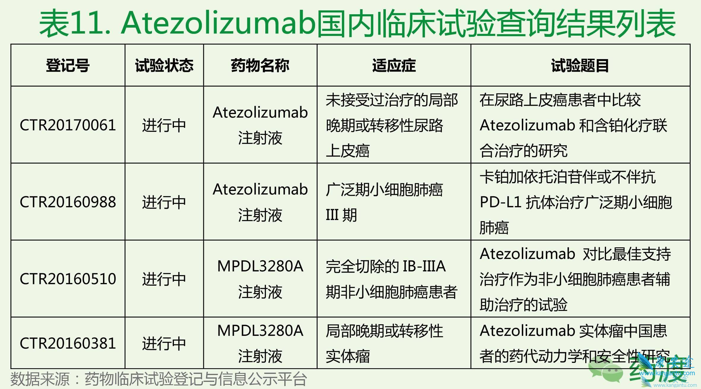 Atezolizumab原研企业已在国内申请临床,并于2016年最早批准临床。详细申报情况如下表10所示。从药审中心临床试验备案平台上查询可知,目前Atezolizumab临床试验也在进行中(见表11)