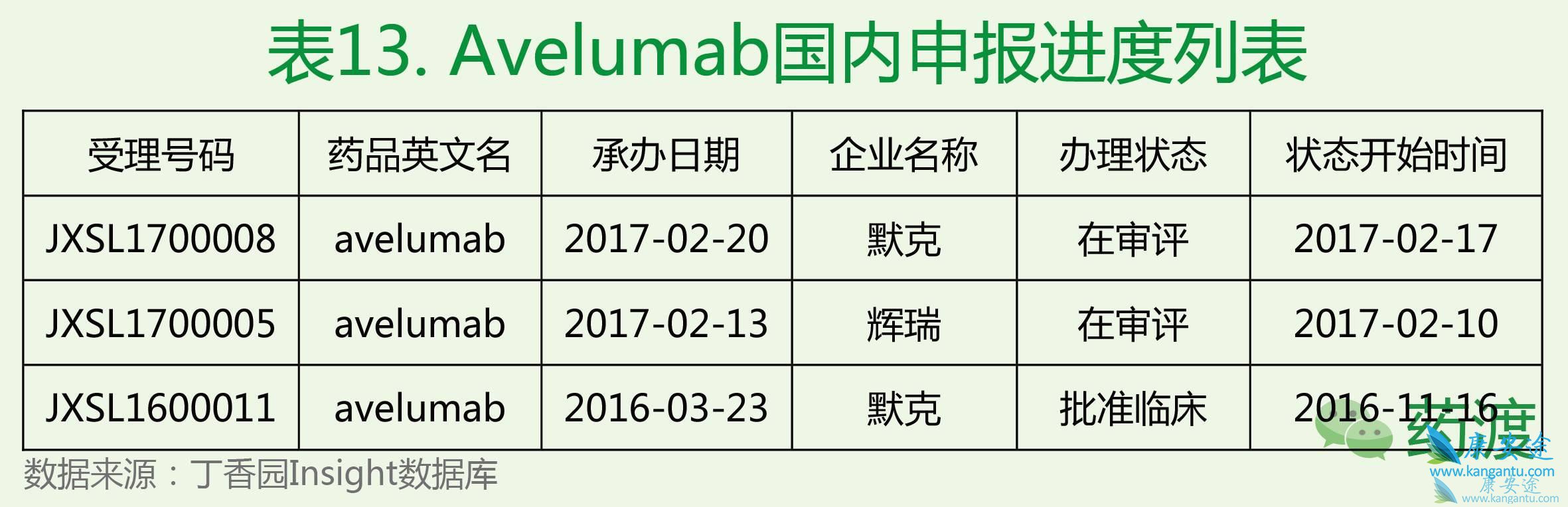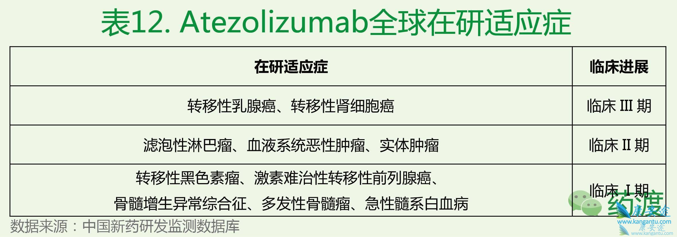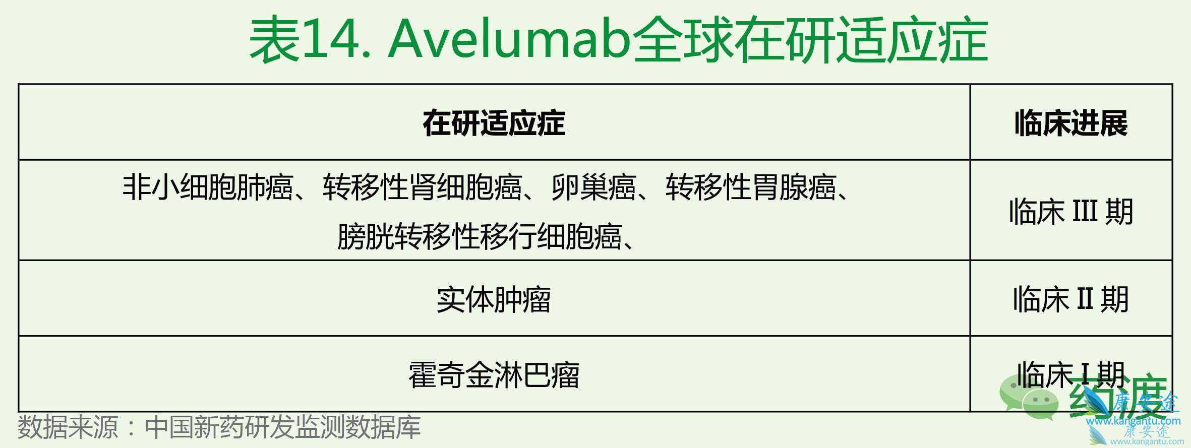 Avelumab目前也有非小细胞肺癌、转移性肾细胞癌等多个适应症已进展到临床 III期。