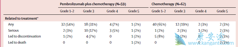 Keytruda联合化疗组3级以上不良反应是40%,化疗组是25%。主要是淋巴细胞减少(23% vs 23%)、血红蛋白下降(17% vs 19%)、中性粒细胞计数下降(14% vs 8%)和血小板减少(9% vs 10%)。严重不良反应发生率分别是24%:8%。不良反映导致停药的发生率分别为11%,13%。