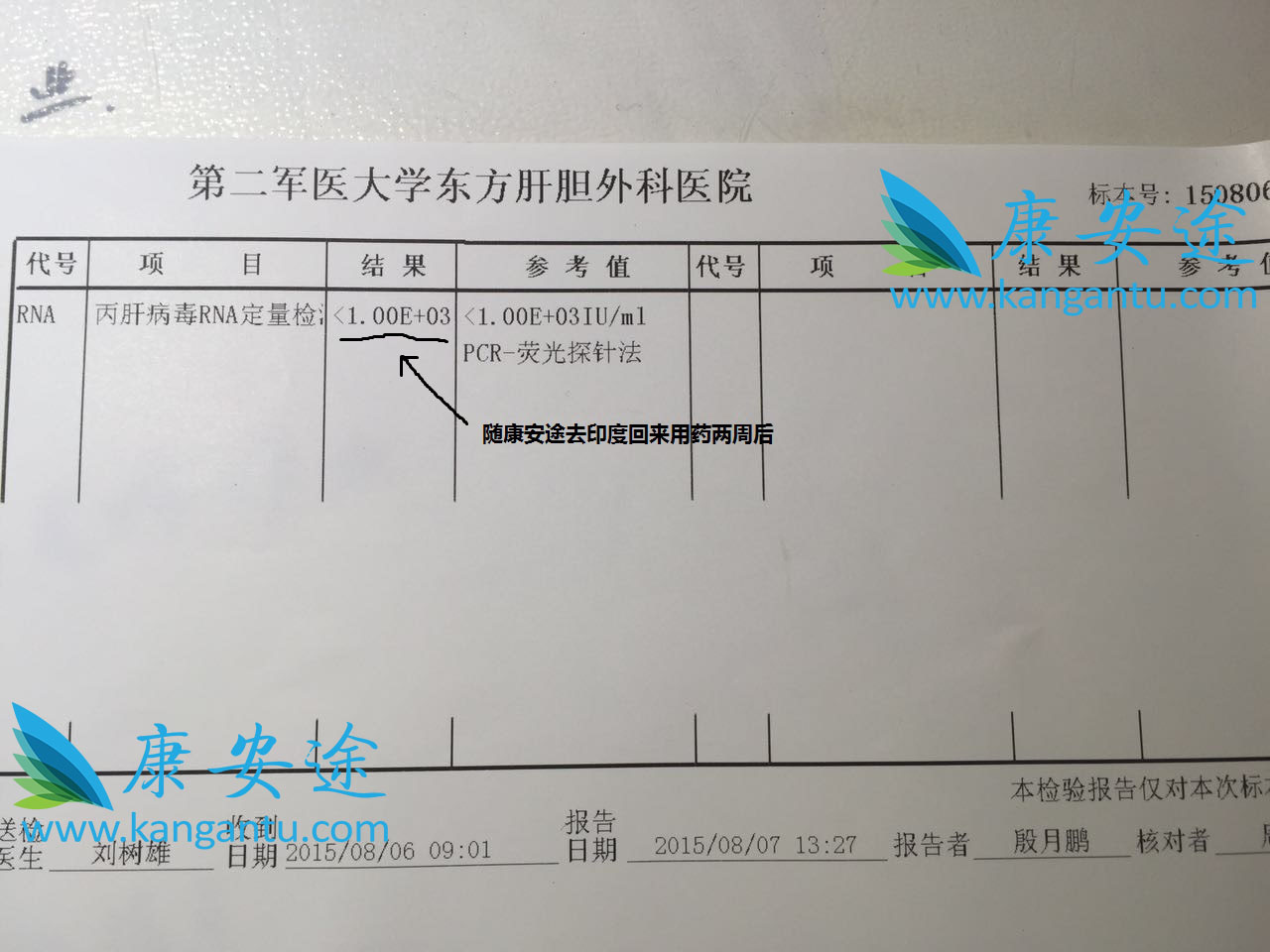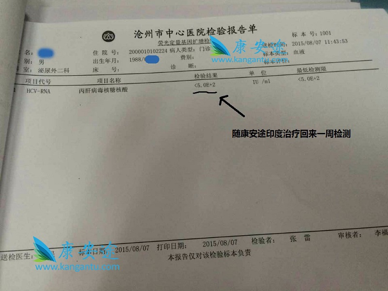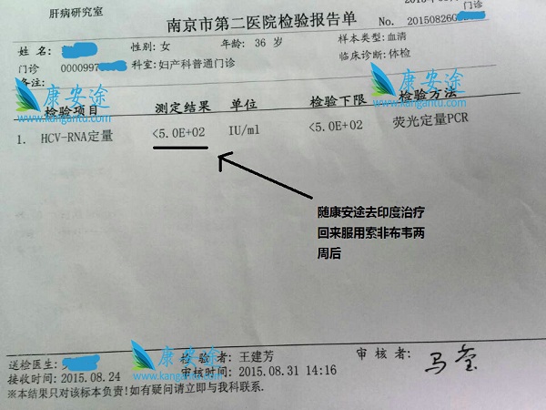 在服用索非布韦前,7月14日检查,HCV-RNA浓度值为1.74461*100000即174461 IU/mL,7月底L先生跟随康安途去印度Mendanta医院治疗,在医院药房拿索非布韦,回国后开始服用,一周后做检测,HCV-RNA的检测结果为<5.0E+2即小于500 IU/mL,已低于最低检测线,99.99%... [详细]