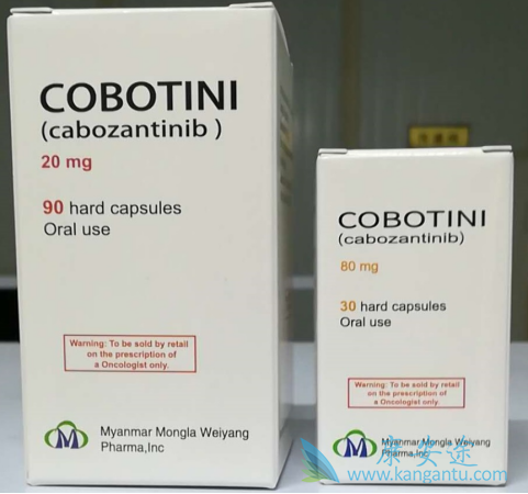 还有一种不太常见的缅甸版本的卡博替尼: 由缅甸蔚杨(Weiyang)药厂生产,商品名:COBOTINI,胶囊剂型,20mg*90粒售价3000元左右。