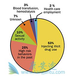 丙型肝炎的主要传播方式已经从输血后感染转移到注射用药。其他传播方式包括医院(例如,在血液透析单位),鼻内可卡因使用,纹身,穿刺,性传播和围产期暴露(图6)。