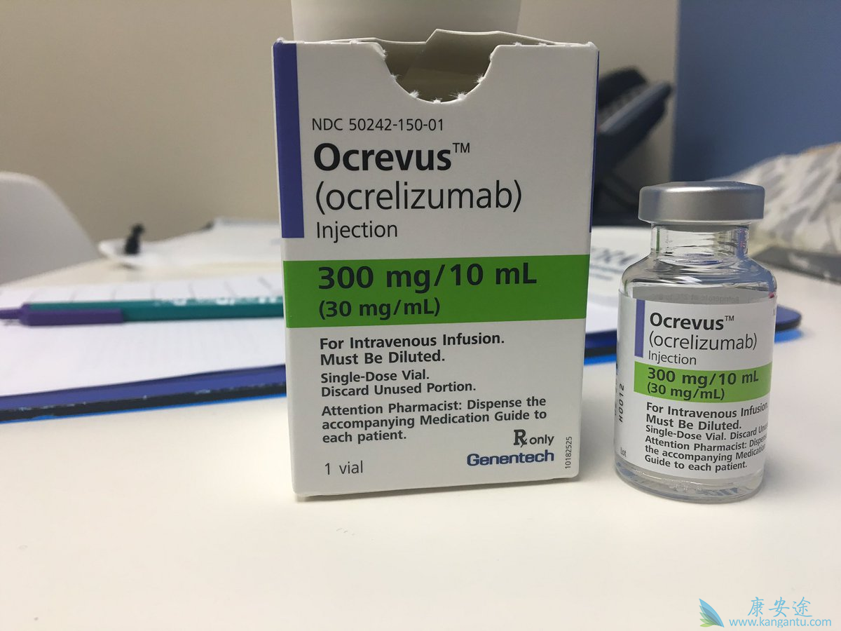 Ocrevus(ocrelizumab)是选择性靶向CD20+ B细胞的人源单抗,是目前为止最长效的MS治疗药物,是首个同时获批治疗复发缓解型多发性硬化症(RRMS,85%)和原发性进展性多发性硬化症(PPMS,15%)两种类型MS的药物。起始剂量为600mg,分2次给药,每周1次300mg,之后治疗剂量为600mg,每6个月给药1次。