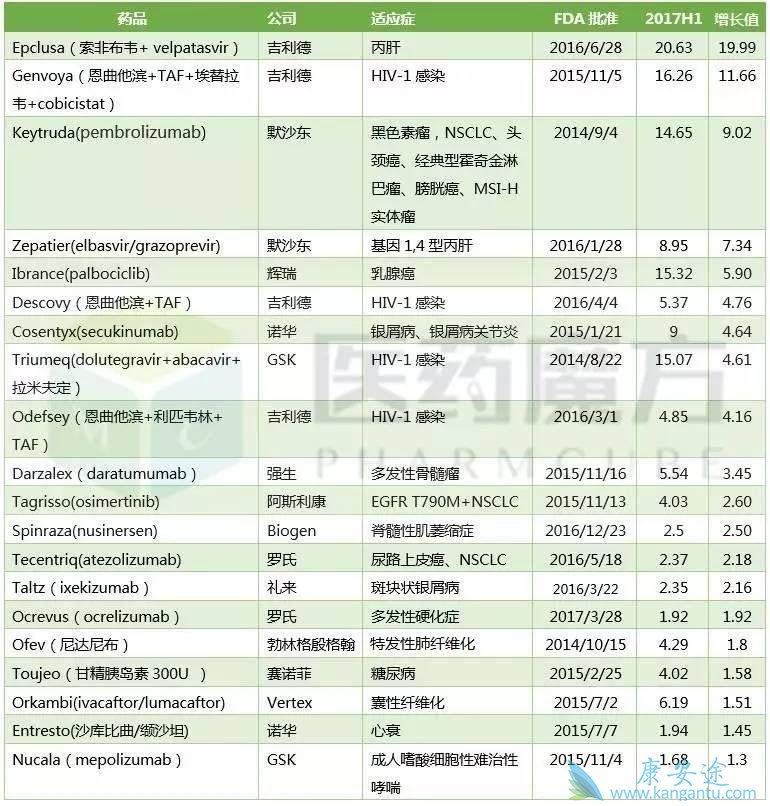 2017H1表现最好的新药TOP20(亿美元)
