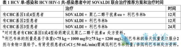 SOVALDI与利巴韦林联用共24周对CHC有基因1型感染患者是接受基于干扰素方案不合格可被考虑为一种治疗选择[见特殊人群中使用(8.8)和临床研究(14.4)]。应通过对个体患者潜在获益和风险的评估指导治疗决策。