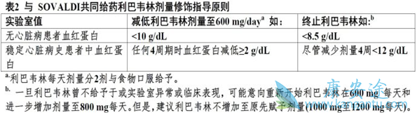 如果某患者有严重不良反应潜在地与利巴韦林相关,应修改或终止利巴韦林剂量,如适当,直至不良反应消退或严重程度减低。表2提供根据患者的血红蛋白浓度和心脏状态对剂量修改和终止指导原则。
