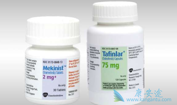达拉非尼与曲美替尼就如同一对双胞胎,通常采用联合治疗的方式对抗癌症,目前FDA批准的适应症包括:黑色素瘤、小细胞肺癌和甲状腺癌。2017年6月,美国FDA批准了达拉非尼与曲美替尼联合治疗用于治疗BRAFV600E突变的转移性非小细胞肺癌,总有效率超过 60%,疾病缓解时间长达 12.6 个月。