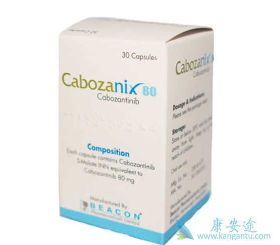目前卡博替尼的主要靶点有:C-met,VEGFR,也有效作用于Ret,Kit,FLT1,FLT3,FLT4,Tie2和AXL,微弱抑制RON和PDGFR-β。其次我们的适应症和用途:适用于治疗进展期、转移性的甲状腺髓样癌(MTC)患者,伴有C-met扩增的晚期非小细胞肺癌(NSCLC)患者。同时我们还要针对不同的卡博替尼适应症重新制定相应的用药方案来治疗。用于治疗转移性甲状腺髓样癌的推荐剂量为每日140 mg,用于晚期非小细胞肺癌的推荐剂量为每日60mg。