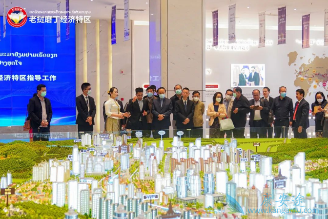 当天上午,贲鹏·彭玛莱西部长一行抵达磨丁经济特区,首先走访参观了特区城市规划展示中心,在展厅内,现场负责人介绍了磨丁的发展历程、区位优势、产业布局、特区政策及物流园区与老中铁路的联动合作。贲鹏·彭玛莱西部长对磨丁特区的发展规划表示赞赏,同时对特区医疗产业规划及相关定位表示认可,他表示:老挝整体医疗水平相对落后,通过磨丁经济特区的产业输送,能为老挝培养大批高精尖医疗行业人才,助力老挝整体公卫发展。随后,贲鹏·彭玛莱西部长先后前往磨丁国门货运通道、磨丁元素制药厂进行参观,在元素制药厂内,他着重询问了药厂的发展情况及未来规划。