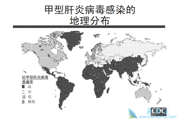 感染率最高的地区为中美洲、南美洲、非洲、中东地区、格陵兰岛、中亚、南亚和东亚。有些流行病学家估计,在发展中国家,12岁和12岁以下儿童的HAV感染率为100%。在小儿甲型肝炎盛行的国家中,由于绝大多数人在幼年时期即已感染HAV,因而成人甲型肝炎患者极为少见。