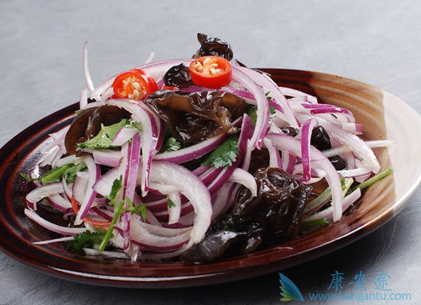 材料:泡发木耳1碗,洋葱1个,豆油1勺,精盐1勺,花椒粉少许