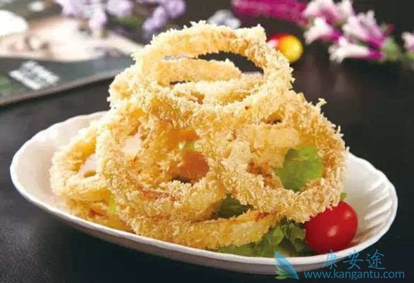 做法:1.混全所有调料,打散,调至糊状。2.洋葱切圈。3.将元葱入调好的糊里,滚上面糊。4.再滚上一层面包糠。5.入预热好的油炸锅,约两分钟。6.蘸上番茄沙司,开吃吧。