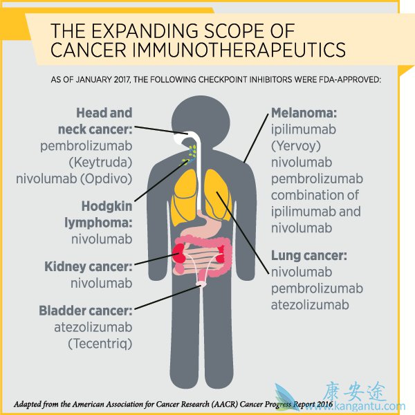 免疫疗法,特别是一类称为免疫检查点抑制剂的免疫治疗剂近年来已经改变了几种类型的癌症治疗。到目前为止,美国食品和药物管理局已经批准了免疫检查点抑制剂来治疗各种癌症,包括黑色素瘤,霍奇金淋巴瘤和肺,肾,膀胱和头颈部的癌症。