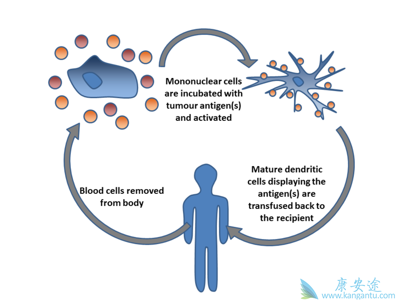 将血细胞从体内移除,与肿瘤抗原一起孵育并活化。然后将成熟的树突状细胞返回到原始的携带癌的供体以诱导免疫应答。