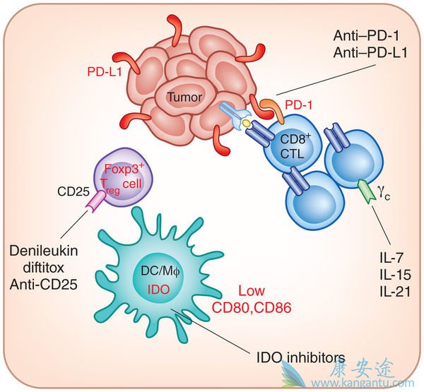 称为PD-1的T细胞上的另一受体提供了一个检查点,以帮助确保T细胞不会对正常细胞造成太多的损伤。然而,当PD-1与APC,PD-L1(L为配体)上的对应物结合时,T细胞可以完全关闭或停用。通常,当活化的T细胞发现癌细胞时,一旦它结合APC激活后显示T细胞的癌细胞表面上的相同抗原,就能杀死它。然而,大多数癌细胞在其表面上具有PD-L1,并以这种方式关闭T细胞逃逸。
