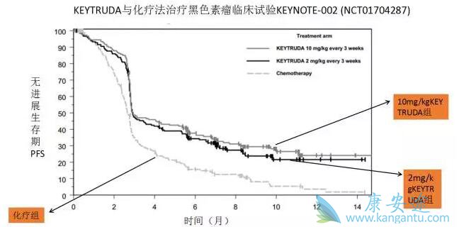 从上面数据图可以看出,KEYTRUDA组患者较化疗组的OS(总生存期)延长。