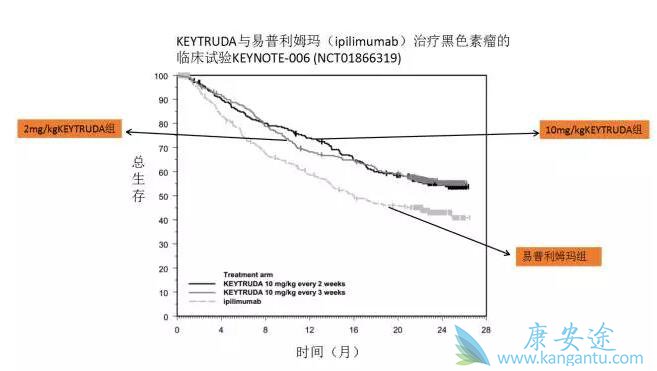 从以上图中可以看出,相比ipilimumab单抗,使用KEYTRUDA组的患者总生存(OS)(可以简单理解为从临床试验开始到到死亡的时间,即生存时间)以及无进展生存期(PFS)(简单理解为疾病从临床试验开始到疾病进展加重的时间)均有延长。