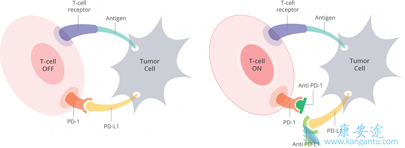 PD-免疫治疗的原理:T细胞号称“人体卫士”,可以识别人体的肿瘤细胞并进行杀伤攻击。但肿瘤细胞是比较狡猾的,它看到T细胞上有个蛋白叫做PD-1,便派出PD-L1蛋白(PD-1的配体)。当PD-1与PD-L1结合后,便提供了抑制性信号,诱导T细胞凋亡、抑制T细胞的活化和增殖,于是肿瘤细胞就会肆无忌惮地增殖。免疫治疗的原理就是阻止PD-1与PD-L1的结合,使T细胞获得自由,纵横驰骋剿灭癌细胞。