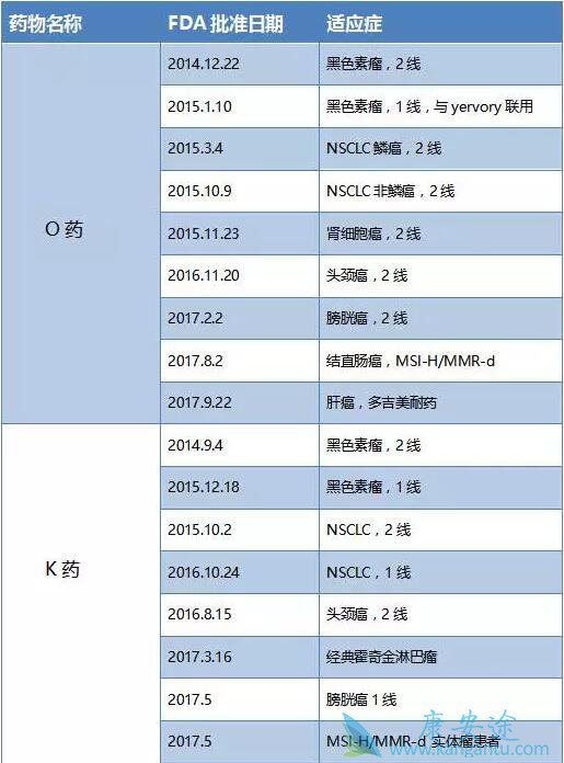 大家最关心的必须还是这两个药在同一个癌种上的临床数据,目前还没有相关临床试验直接对比这两种PD-1抗体药物的效果,对比数据都是基于既往的文献资料和美国或欧盟药品管理局披露的数据。有研究者统计了O药和K药治疗黑色素瘤、非小细胞肺癌、泌尿生殖系统肿瘤临床实验的效果,两者客观缓解率相似(Carbognin et al., 2015)。另一项对1887例化疗后使用O药或K药的非小细胞肺癌患者的统计研究表明两种药物在客观缓解率、总生存期、无进展生存期等方面均无显著性差异,严重不良反应类型和不良反应比例也相似,使用O药的患者>3级不良反应比例要稍少于K药,这也可能与不良反应管理方案和报告机制有关(Peng et al., 2017)。但值得注意的是,众多临床试验中PD-L1表达阳性的患者,客观缓解率明显高于阴性患者;同时也有临床研究选择TMB(肿瘤突变负荷)作为区分能从免疫治疗药物中获益的生物标记物。