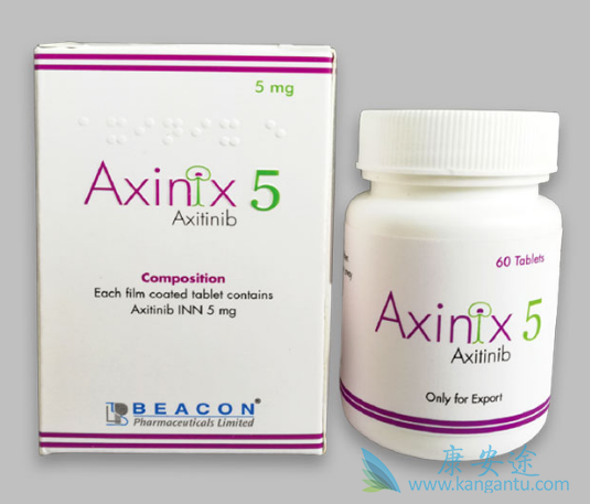 阿昔替尼的主要作用于降低血管内皮生长因子受体1-3,c-KIT和血小板衍生的生长因子受体的表达,所以能够抑制肿瘤血管生成。也有研究指出,阿昔替尼可以诱导癌细胞自噬。2008至2016年,阿昔替尼进行了三期随机临床试验,该三期临床结果显示,阿昔替尼可以显著提高患者的无进展生存期,适合作为晚期肾细胞癌的二线治疗药物。2018 NCCN肾癌指南中,阿昔替尼被列为了不能进行手术切除、复发或晚期肾细胞癌患者的一线和二线治疗药物的选择。