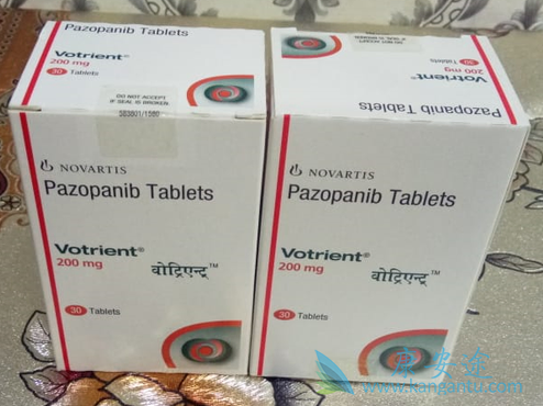 在2009 年帕唑帕尼(Votrient)被批准用于已接受过化疗的进展期软组织肉瘤患者的治疗。它成为了第 6 种针对这一适应症的药物。帕唑帕尼的安全性和有效性在同一个叫做 PALETTE 的 III 期临床试验中被证明。该试验入组了 369 名之前接受过治疗的进展期软组织肉瘤患者。该研究的主要结局指标是无进展生存期。帕唑帕尼的结局指标被证明优于安慰剂,且差异具有统计学显着性和临床意义。安慰剂组无进展生存期中位数是 1.6 个月,而帕唑帕尼组则为 4.6 个月,相对危险比(HR)0.35(95% 置信区间:0.26 至 0.48;P < .001)。
