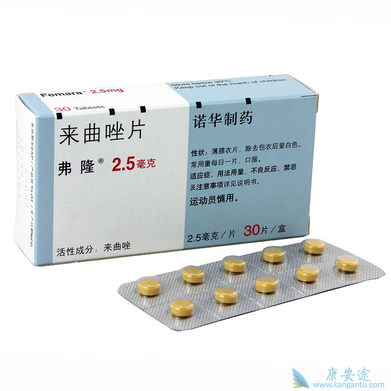 参考用法用量:来曲唑片每次2.5 mg,口服,每日1次。性别、年龄及肝肾功能与弗隆无临床相关关系,故老年患者和肝肾功能受损的患者不必调整弗隆剂量。不良反应:弗隆的不良反应多为轻度或中度,以恶心(2%~9%)、头疼(0%~7%)、骨痛(4%~10%)、潮热(0%~9%)和体重增加(2%~8%)为主要表现,其他少见的还有便秘、腹泻、瘙痒、皮疹、关节痛、胸痛、腹痛、疲倦、失眠、头晕、水肿、高血压、心律不齐、血栓形成、呼吸困难、阴道流血等。