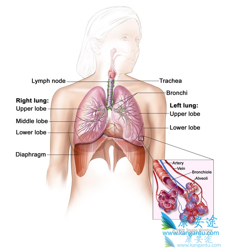 肺部是在人体胸腔内的锥形呼吸器官。在呼吸时,肺部会吸入氧气,呼出二氧化碳等其他废弃物。每个肺都有斜裂,左侧肺部有两个斜裂,右侧有三个,这些斜裂被称之为肺叶。被称之为支气管的两根气管从气管延伸进入肺部。